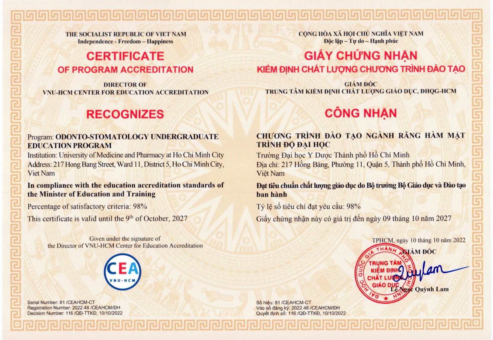 Giấy chứng nhận vx88m Chất lượng vx88 code vx88 Bác sĩ Răng Hàm Mặt theo tiêu chuẩn Bộ Giáo dục và Đào tạo