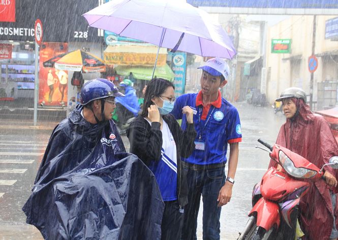 TPO - Cơn mưa nặng hạt vào đầu buổi thi Ngoại ngữ khiến nhiều thí sinh lẫn phụ huynh bị thấm ướt. Không ngại dính ướt, các tình nguyện viên chương trình Tiếp sức mùa thi TPHCM đang trực chốt ở Trường THCS Lê Lợi (quận 3) đã mang dù ra đón và che các em vào phòng thi được khô ráo.