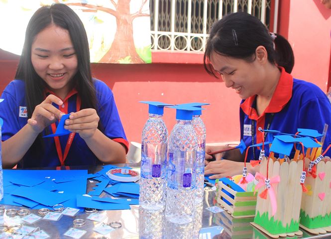 Các bạn tình nguyện viên ĐH Y dược TPHCM tại điểm thi THCS Colette (quận 3) làm những vật phẩm dễ thương để gửi tặng các em thí sinh