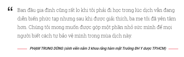 Tương tự, bạn Phạm Trung Dũng (sinh viên năm 3 khoa răng hàm mặt Trường ĐH Y dược TP.HCM) cũng kể: "Để tham gia đội hình này, chúng tôi hiện đã trang bị đầy đủ khẩu trang, dung dịch rửa tay và các tài liệu tuyên truyền phòng chống dịch COVID-19. Tôi cũng gọi về nhà xin phép ba mẹ để tham gia đội hình này".