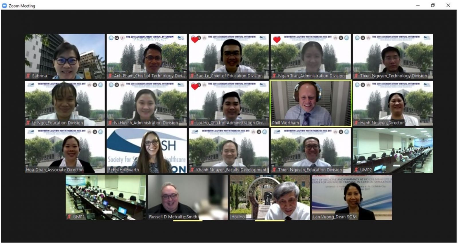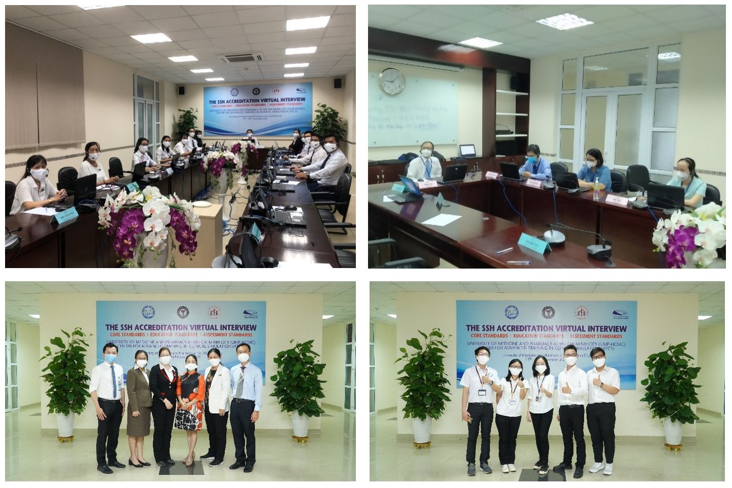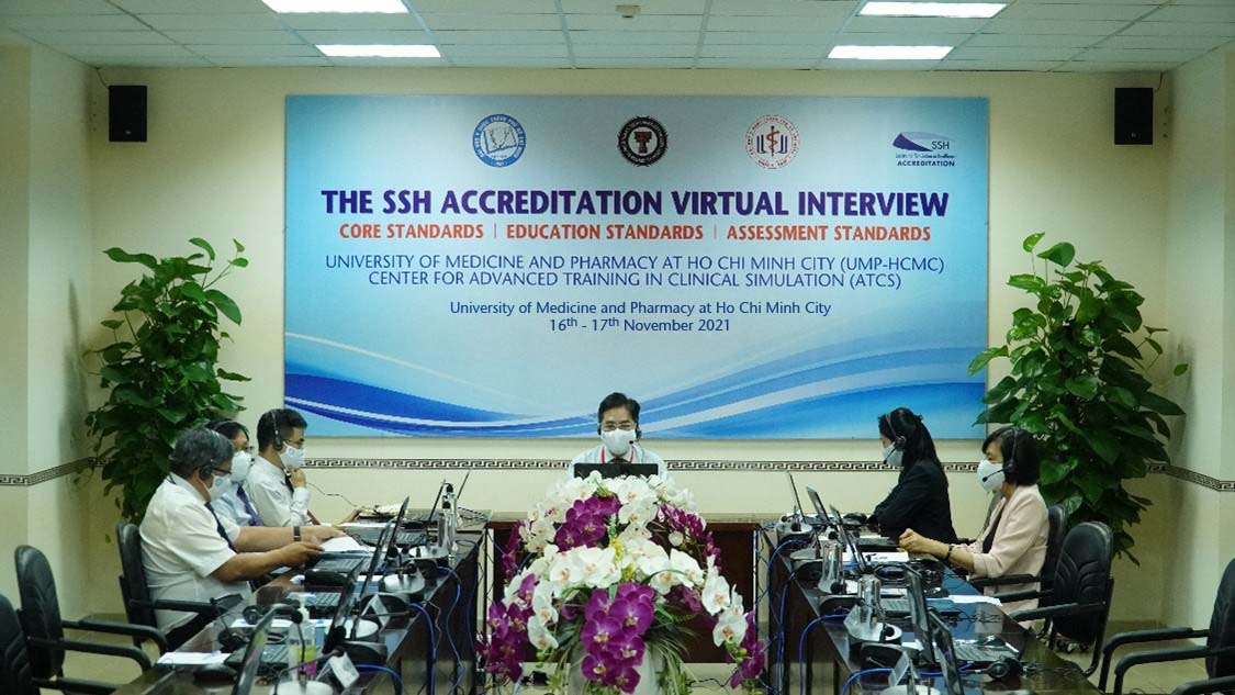 Thực hiện kế hoạch chiến lược phát triển, Trung tâm ATCS đã tham gia phỏng vấn kiểm định chính thức (Full Accreditation) theo hình thức trực tuyến của Hiệp hội Mô phỏng Y Khoa quốc tế (SSH) về các Tiêu chuẩn Cốt lõi - Giảng dạy và Lượng giá trong mô phỏng lâm sàng vào ngày 16 và 17/11/2021, với sự tham gia phỏng vấn của Thầy Cô lãnh đạo Nhà trường, Ban Chủ nhiệm Khoa Y, toàn thể cán bộ nhân viên ATCS, đại diện Giảng viên bộ môn lâm sàng, Sinh viên y khoa các khối, Người bệnh chuẩn và đặc biệt là sự hỗ trợ của Giáo sư Hồ Hội.