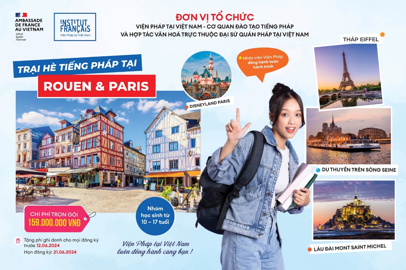 Trại hè diễn ra trong 2 tuần, từ 4/8 đến 18/08/2024, tại Rouen và Paris, dành cho nhóm học sinh từ 10-17 tuổi có trình độ tiếng Pháp từ cơ bản đến nâng cao, với nội dung chủ yếu là các chuyến tham quan, dã ngoại, các hoạt động thể thao và khám phá văn hóa, như tham quan Lâu đài Mont Saint Michel, những vách đá Etretat vốn được xem là một siêu phẩm thiên nhiên kỳ vĩ,…