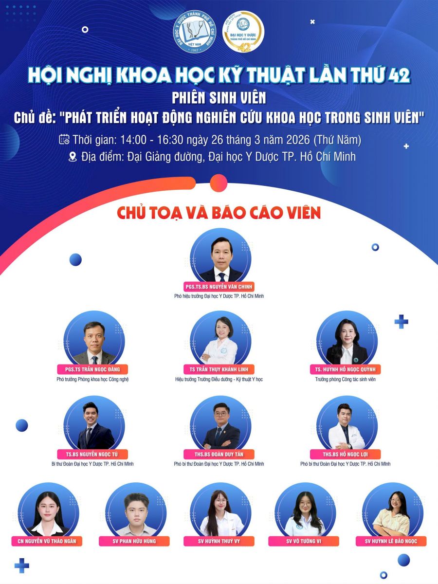 Trong khuôn khổ Hội nghị Khoa học Công nghệ lần thứ 42 của vx88 esball Thành phố Hồ Chí Minh, Phiên sinh viên với chủ đề “Phát triển hoạt động nghiên cứu khoa học trong sinh viên” sẽ được tổ chức vào lúc 14:00 - 16:30 ngày 26 tháng 03 năm 2026 tại Đại giảng đường (217 Hồng Bàng, Phường Chợ Lớn, Thành phố Hồ Chí Minh).