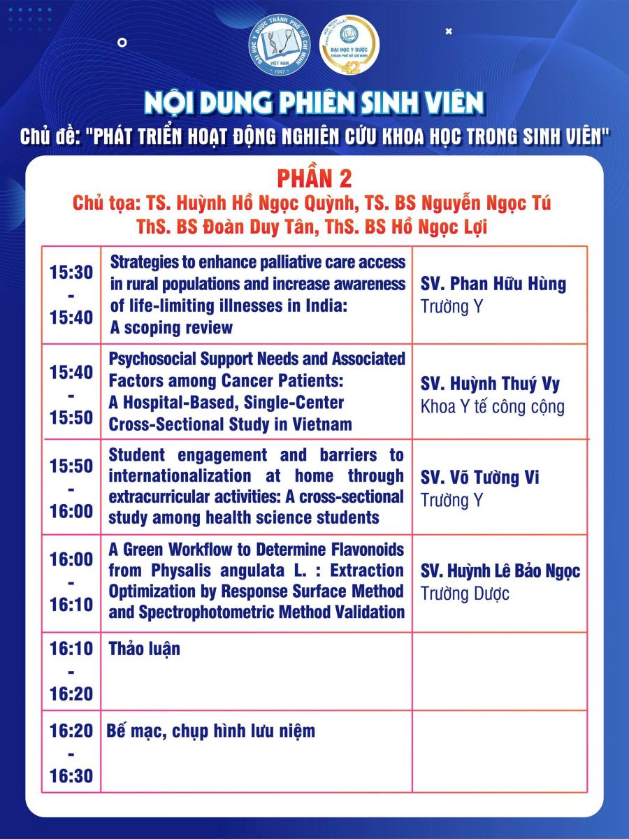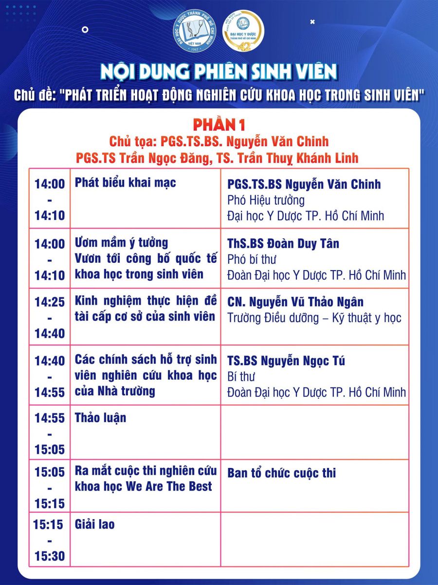 Phiên sinh viên là diễn đàn học thuật nhằm chia sẻ các định hướng và giải pháp thiết thực trong việc hỗ trợ, phát triển hoạt động nghiên cứu khoa học trong sinh viên. Đồng thời, chương trình gồm các bài báo cáo giới thiệu những công trình nghiên cứu tiêu biểu đã được công bố trên các tạp chí quốc tế uy tín do sinh viên là tác giả chính, góp phần minh chứng cho năng lực nghiên cứu và khả năng hội nhập học thuật quốc tế của sinh viên vx88 esball Thành phố Hồ Chí Minh.