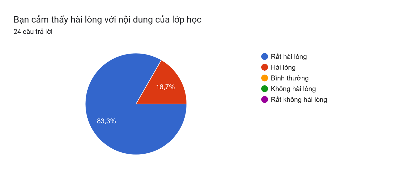 Khảo sát sau khi tham gia khóa học, 100% học viên đánh giá mức độ “rất hài lòng” hoặc “hài lòng” về chất lượng nội dung và giảng dạy: