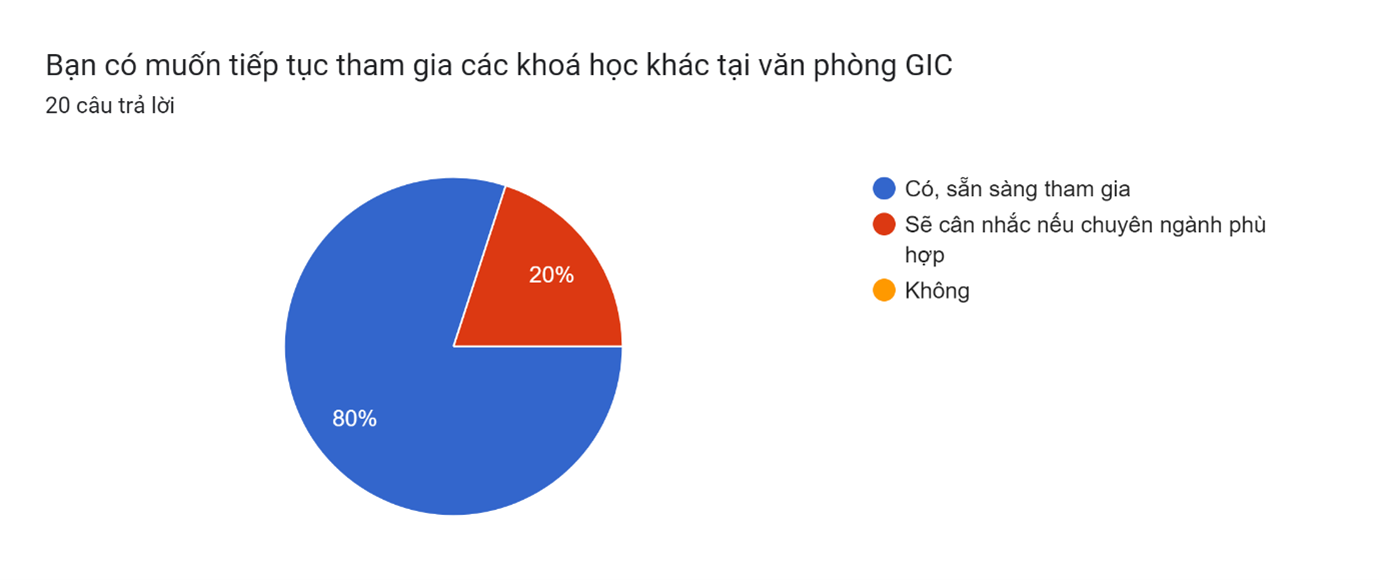 Ngoài ra, 80% học viên cho biết là sẽ tiếp tục tham gia các khóa học khác tại văn phòng GIC và 20% sẽ cân nhắc nếu chuyên ngành phù hợp: