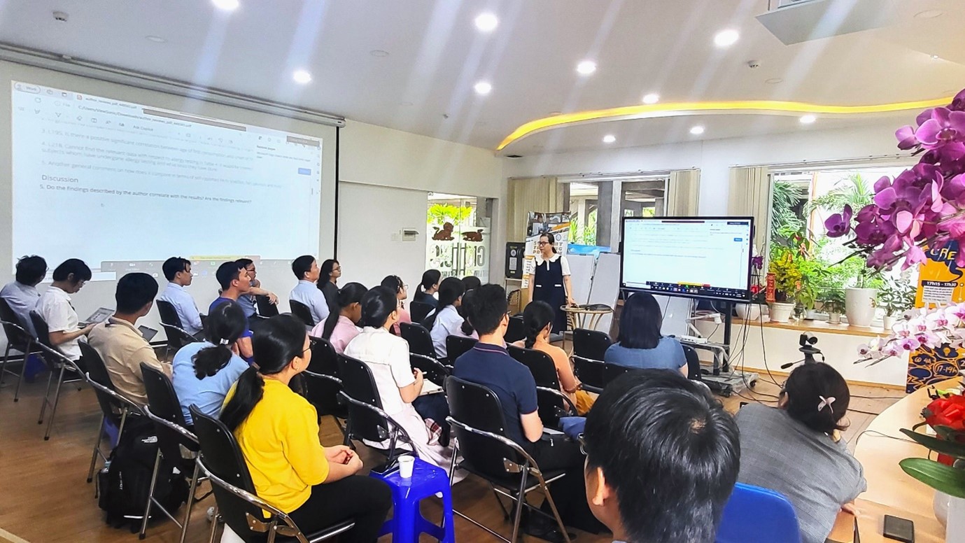 Hình ảnh học viên cùng PGS. TS Thái Thanh Trúc trong buổi học sáng 25/05/2024 với chủ đề viết - trình bày phần vx88b trong bài báo và hướng dẫn chọn tài liệu khoa học tin cậy