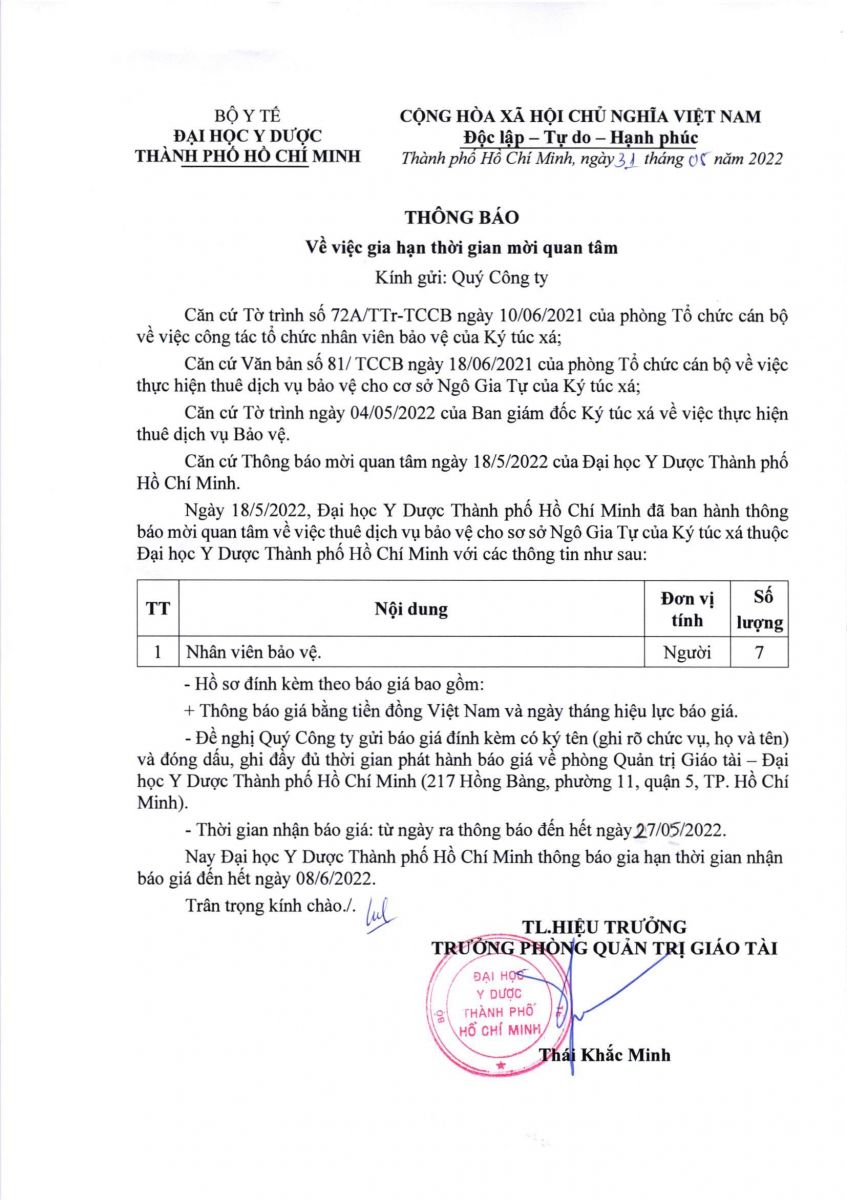 Thời gian gia hạn nhận báo giá từ ngày 31/5/2022 đến ngày 08/6/2022