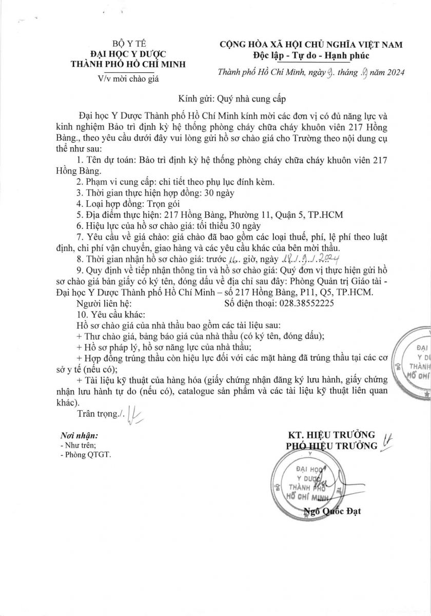 Thời gian nhận hồ sơ chào giá: từ ngày ra thông báo đến trước 16 giờ 00 ngày 18/9/2024