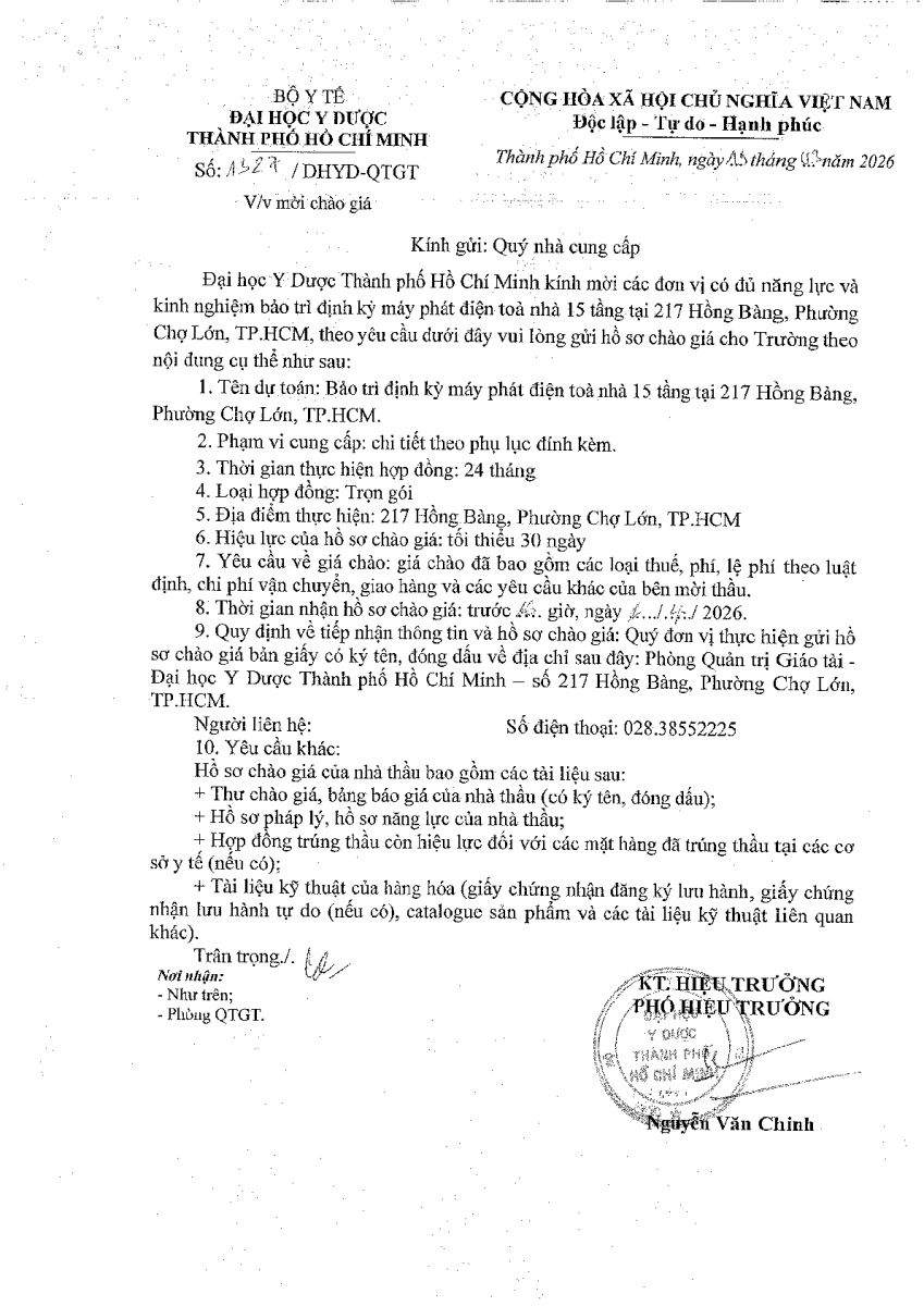 Thời gian nhận hồ sơ chào giá: từ ngày ra thông báo đến trước 16 giờ 00, ngày 01/4/2026