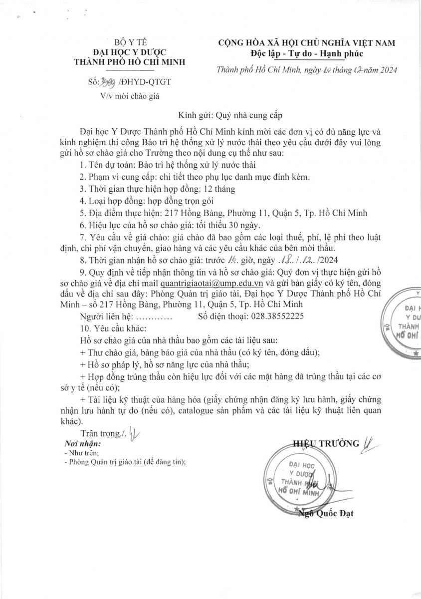 Thời gian nhận hồ sơ chào giá: từ ngày ra thông báo đến trước 16 giờ, ngày 18/12/2024