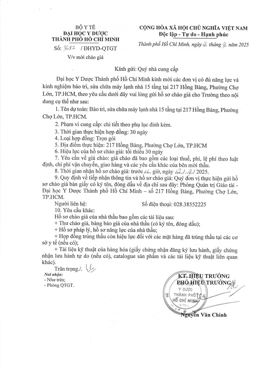 Thời gian nhận hồ sơ chào giá: từ ngày ra thông báo đến trước 16 giờ, ngày 12/9/2025