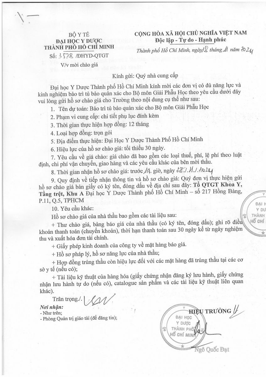 Thời gian nhận hồ sơ chào giá: từ ngày ra thông báo đến trước 14 giờ 00 ngày 27/11/2024