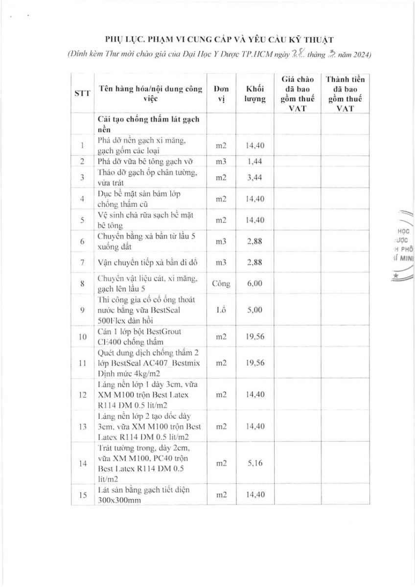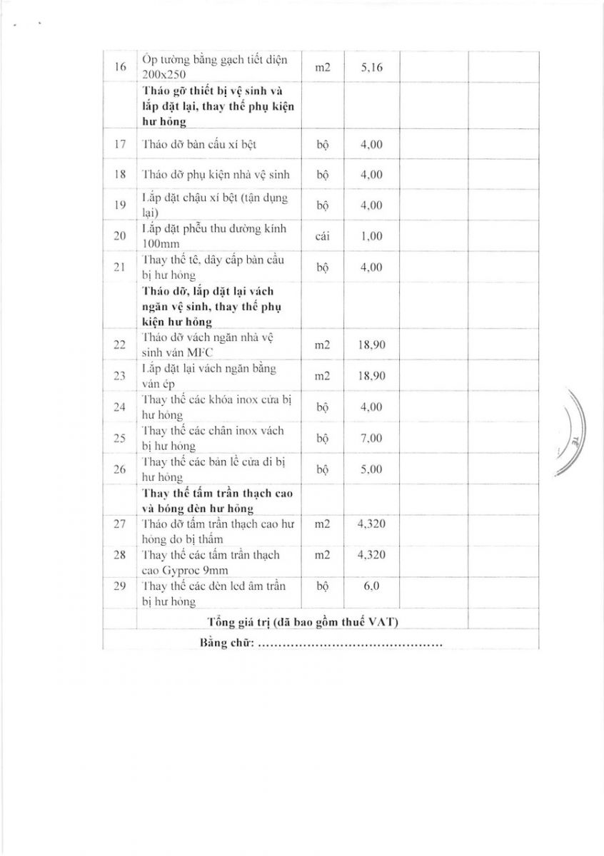 vx88 code mời chào giá: "Cải tạo chống thấm lát gạch và thay thế phụ kiện vách ngăn vệ sinh trần đèn bị hư hỏng tại nhà vệ sinh nữ lầu 5 trục bắc" Tòa nhà 15 tầng - vx88 esball vx88b