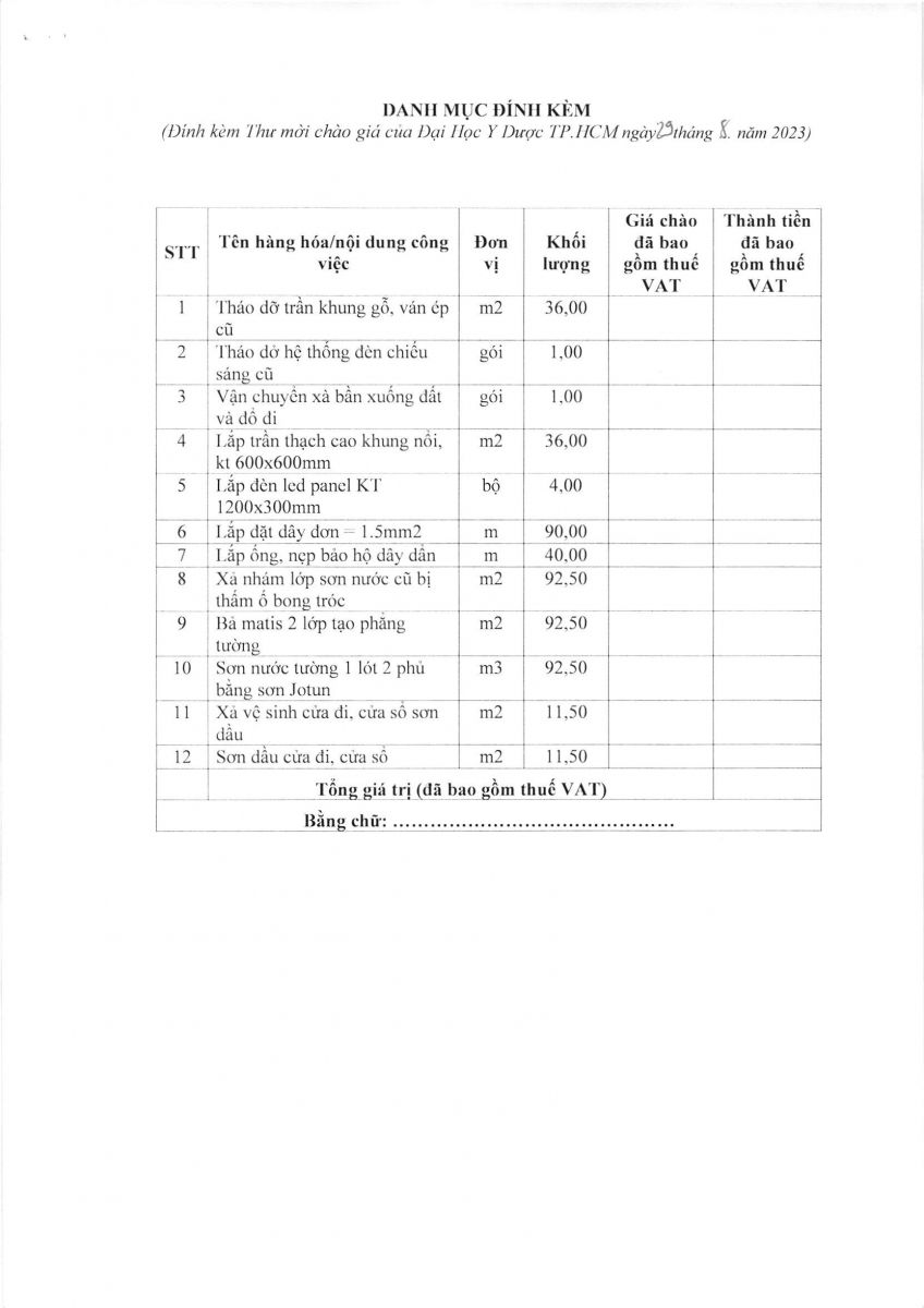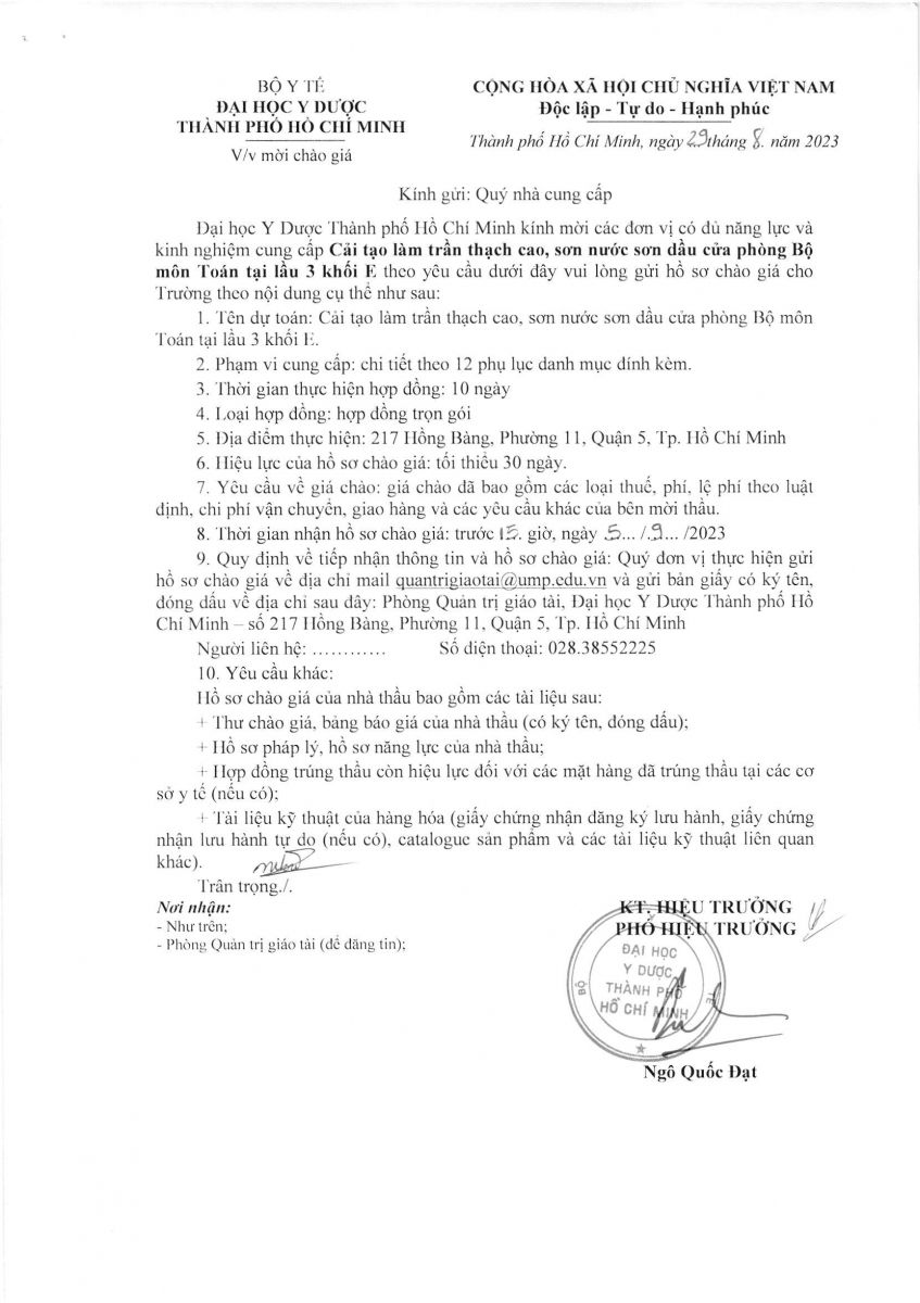 Thời gian nhận hồ sơ chào giá: Từ ngày ra thông báo đến trước 15 g 00 ngày 05/9/2023