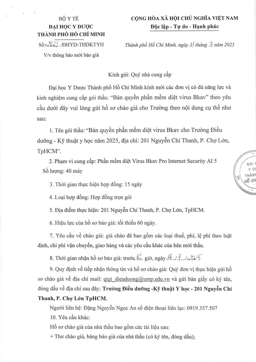 Thời gian nhận hồ sơ chào giá: từ ngày ra thông báo đến trước 16 giờ, ngày 16/7/2025