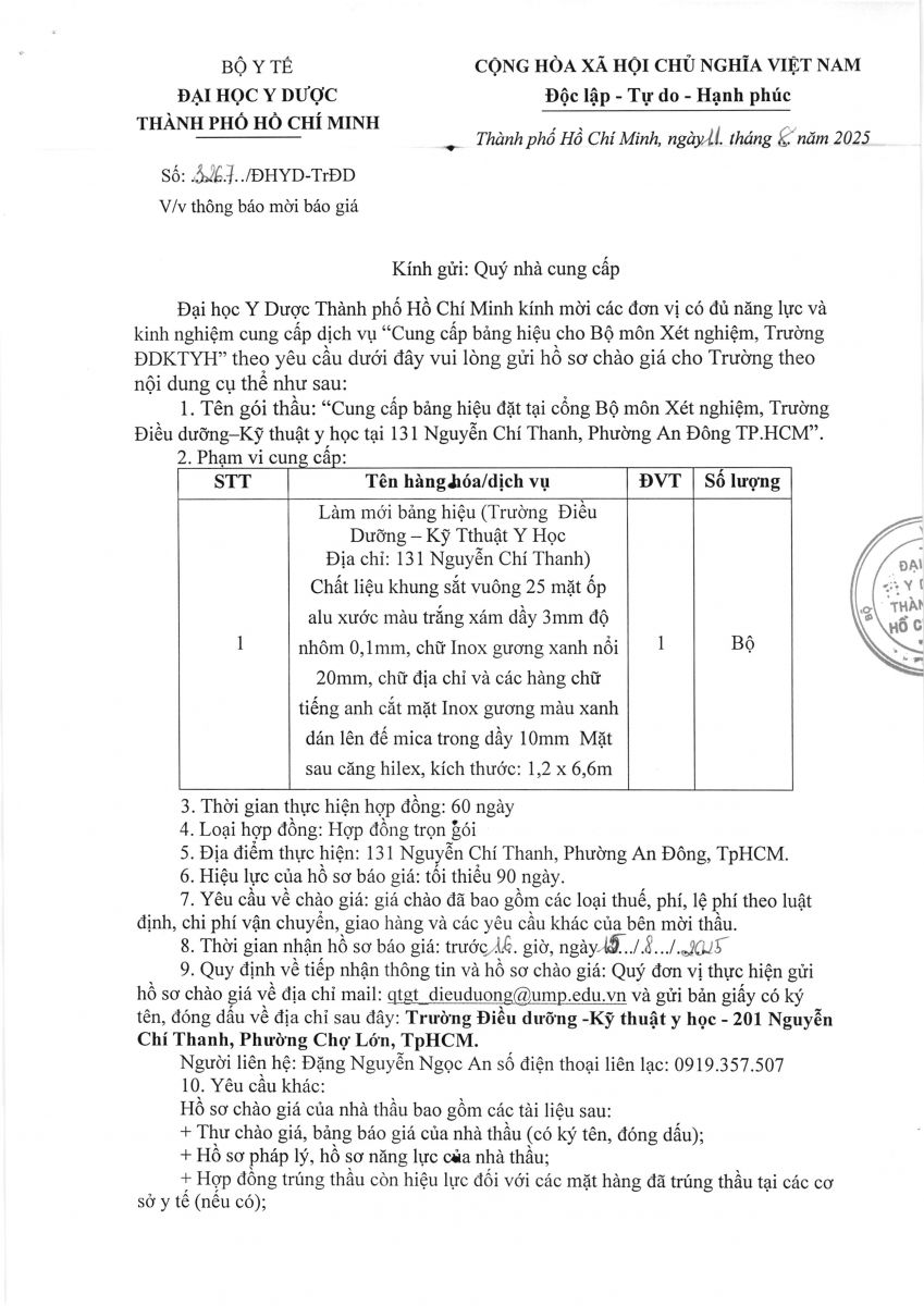 Thời gian nhận hồ sơ chào giá: từ ngày ra thông báo đến trước 16 giờ, ngày 15/8/2025