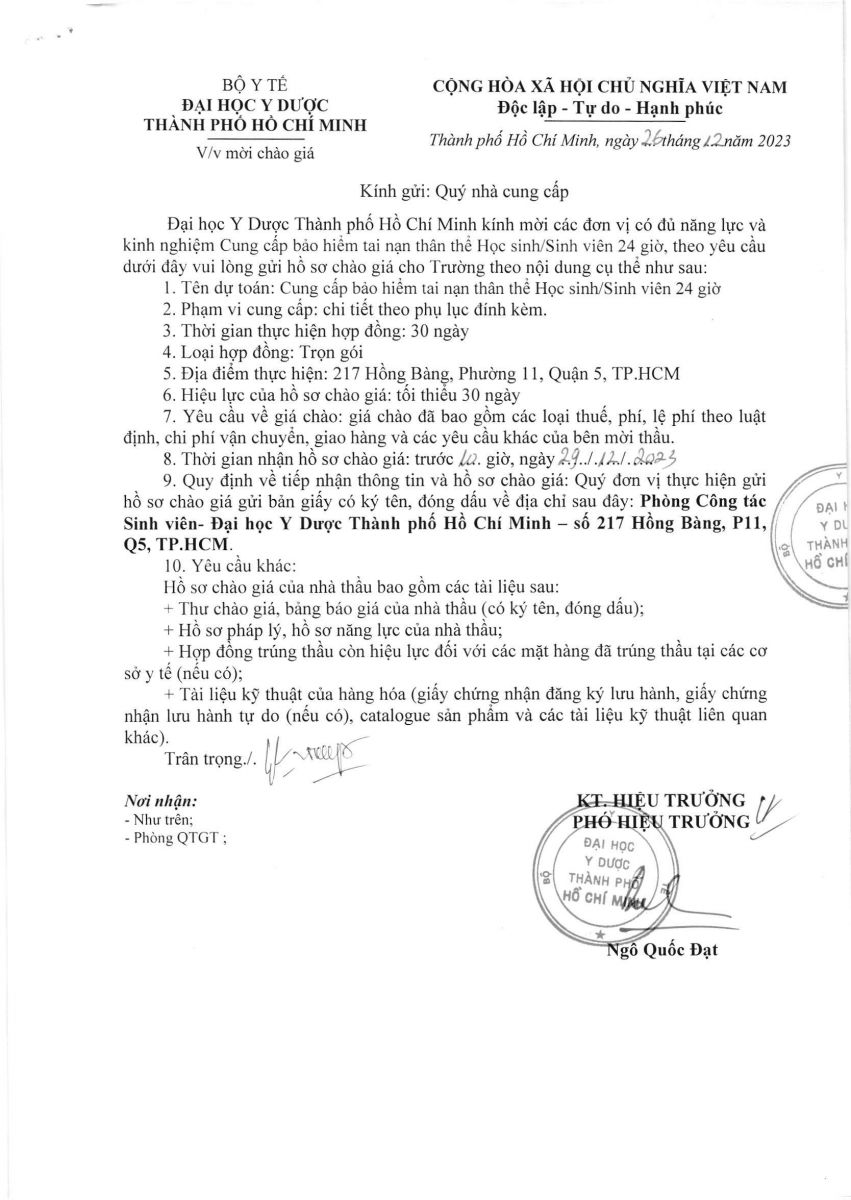 Thời gian nhận hồ sơ chào giá: từ ngày ra thông báo đến trước 10g00 ngày 29/12/2023
