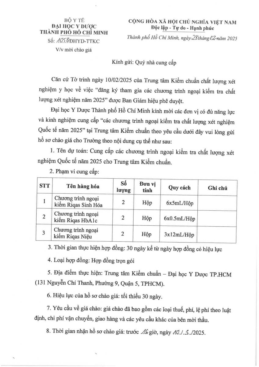 Thời gian nhận hồ sơ chào giá: từ ngày ra thông báo đến trước 16 giờ, ngày 10/3/2025