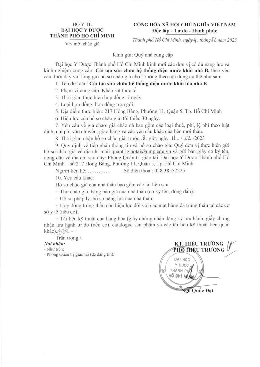 Thời gian nhận hồ sơ chào giá: từ ngày ra thông báo đến trước 8g00 ngày 11/12/2023