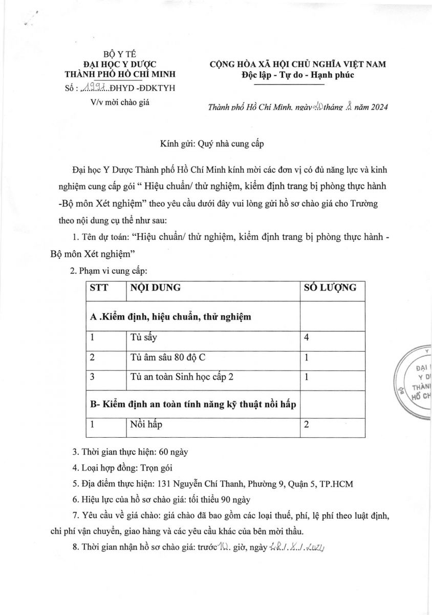 Thời gian nhận hồ sơ chào giá: từ ngày ra thông báo đến trước 10 giờ 00 ngày 28/8/2024