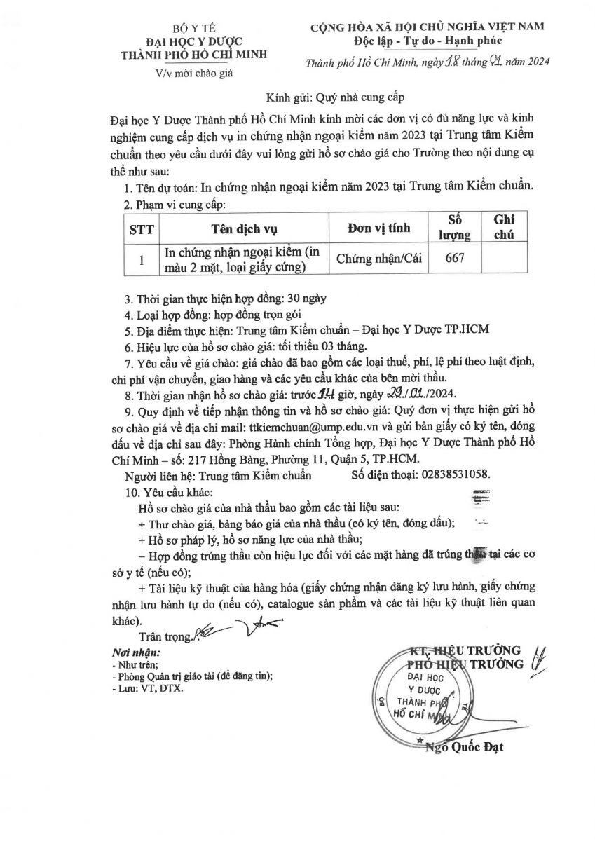 Thời gian nhận hồ sơ chào giá: từ ngày ra thông báo đến trước 14g00 ngày 29/01/2024