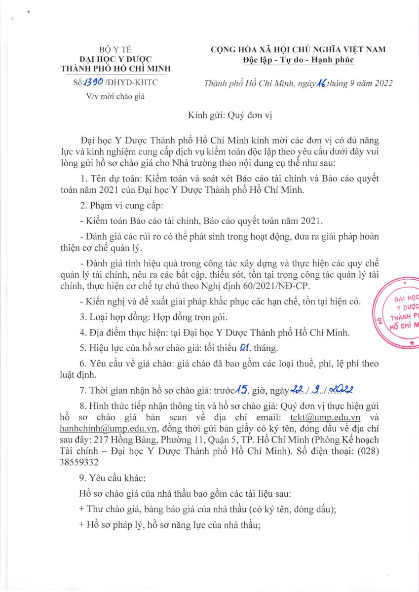 Thời gian nhận hồ sơ chào giá: từ ngày ra thông báo đến trước 15 giờ ngày 22/9/2022