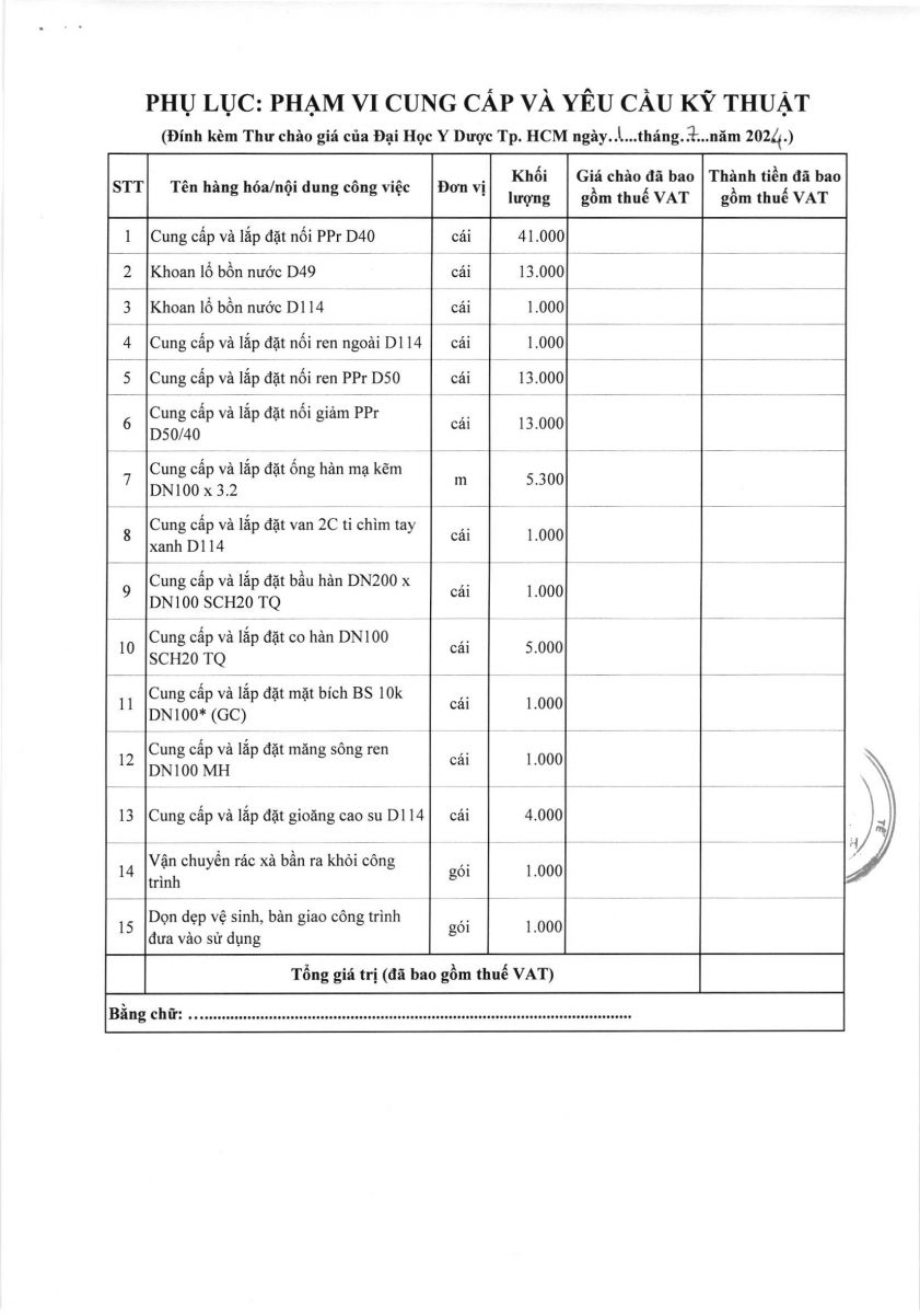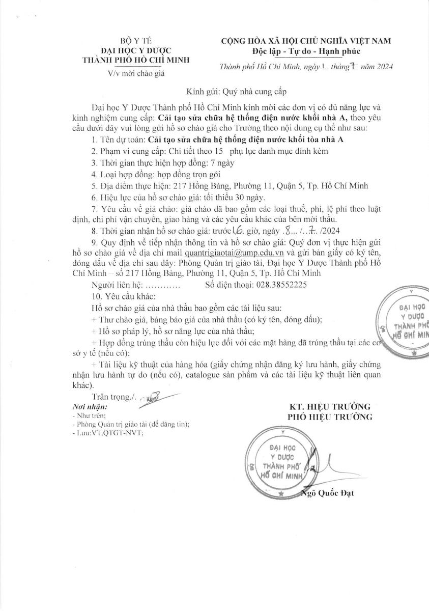 Thời gian nhận hồ sơ chào giá: từ ngày ra thông báo đến trước 16 giờ 00 ngày 08/7/2024
