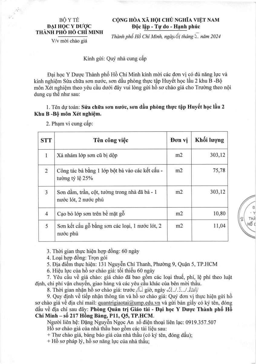 Thời gian nhận hồ sơ chào giá: từ ngày ra thông báo đến trước 10 giờ 00 ngày 21/5/2024
