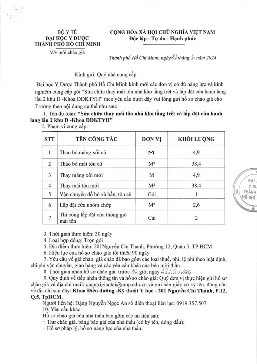 Thời gian nhận hồ sơ chào giá: từ ngày ra thông báo đến trước 10 giờ 00 ngày 27/6/2024