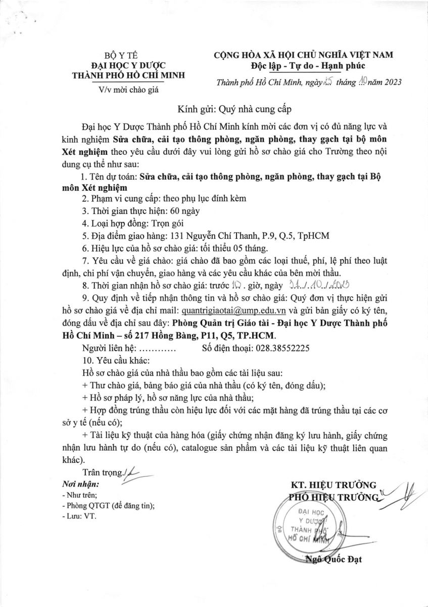 Thời gian nhận hồ sơ chào giá: từ ngày ra thông báo đến trước 10g00 ngày 31/10/2023