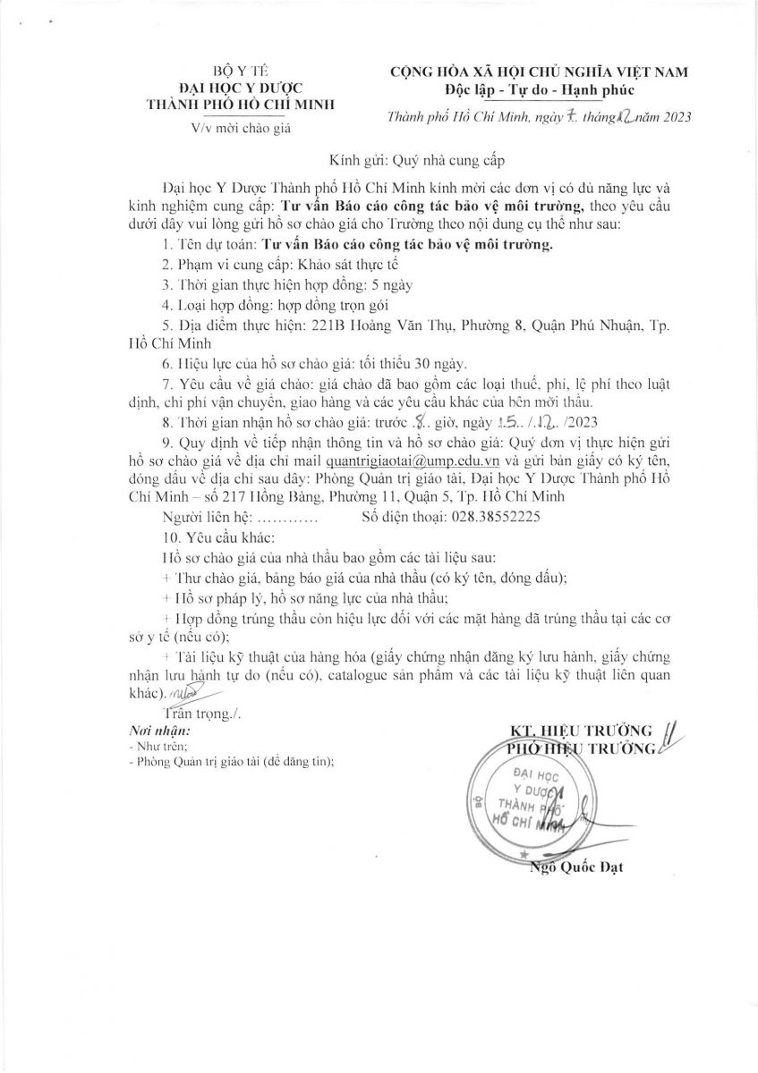 Thời gian nhận hồ sơ chào giá: từ ngày ra thông báo đến trước 8g00 ngày 15/12/2023