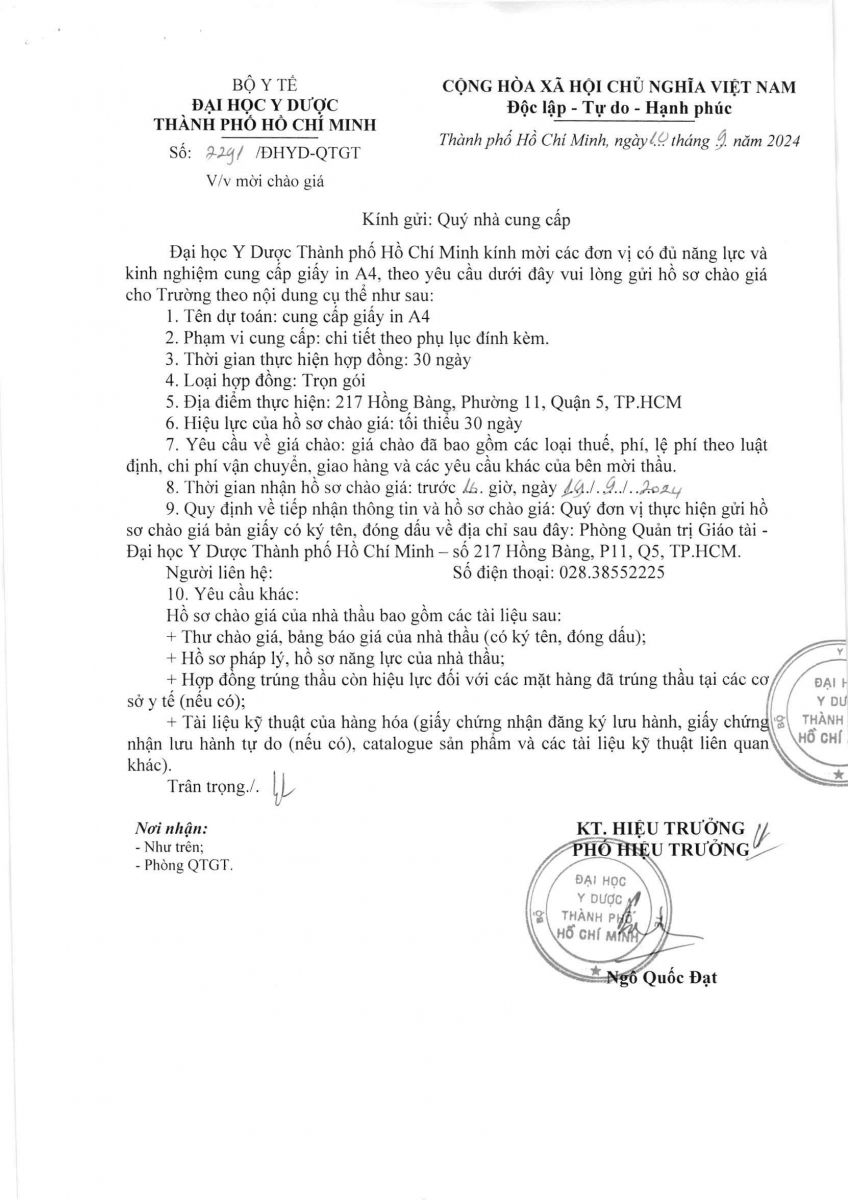 Thời gian nhận hồ sơ chào giá: từ ngày ra thông báo đến trước 16 giờ 00 ngày 19/9/2024