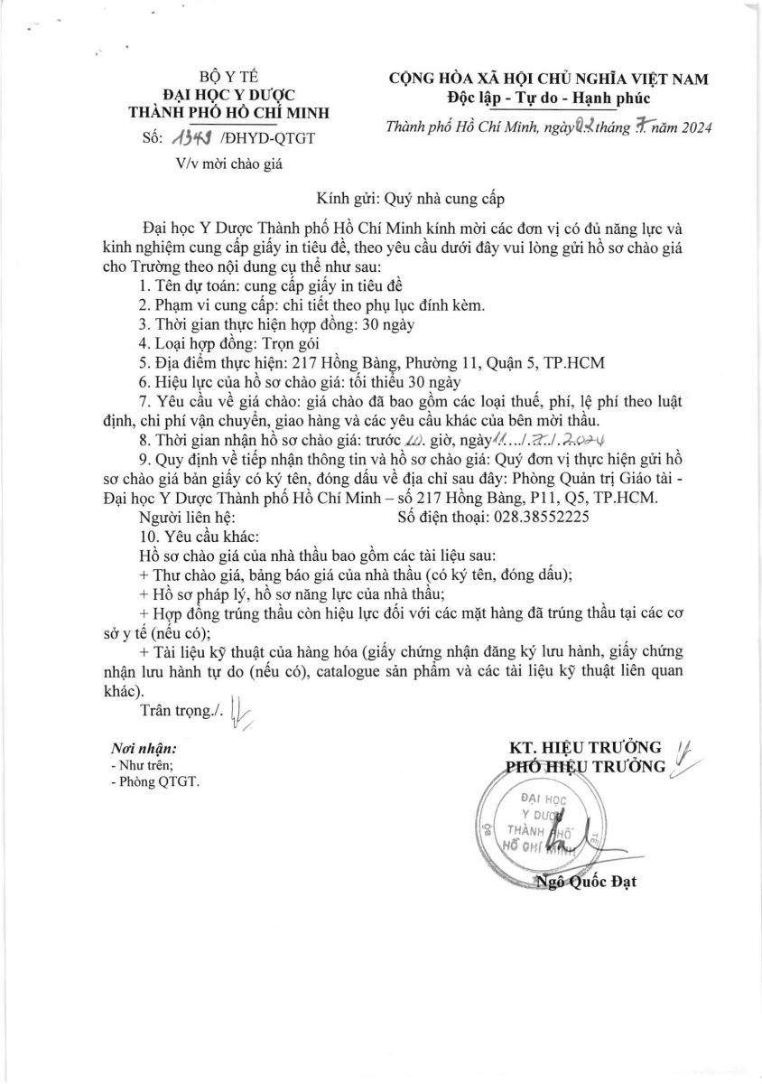 Thời gian nhận hồ sơ chào giá: từ ngày ra thông báo đến trước 10 giờ 00 ngày 11/7/2024