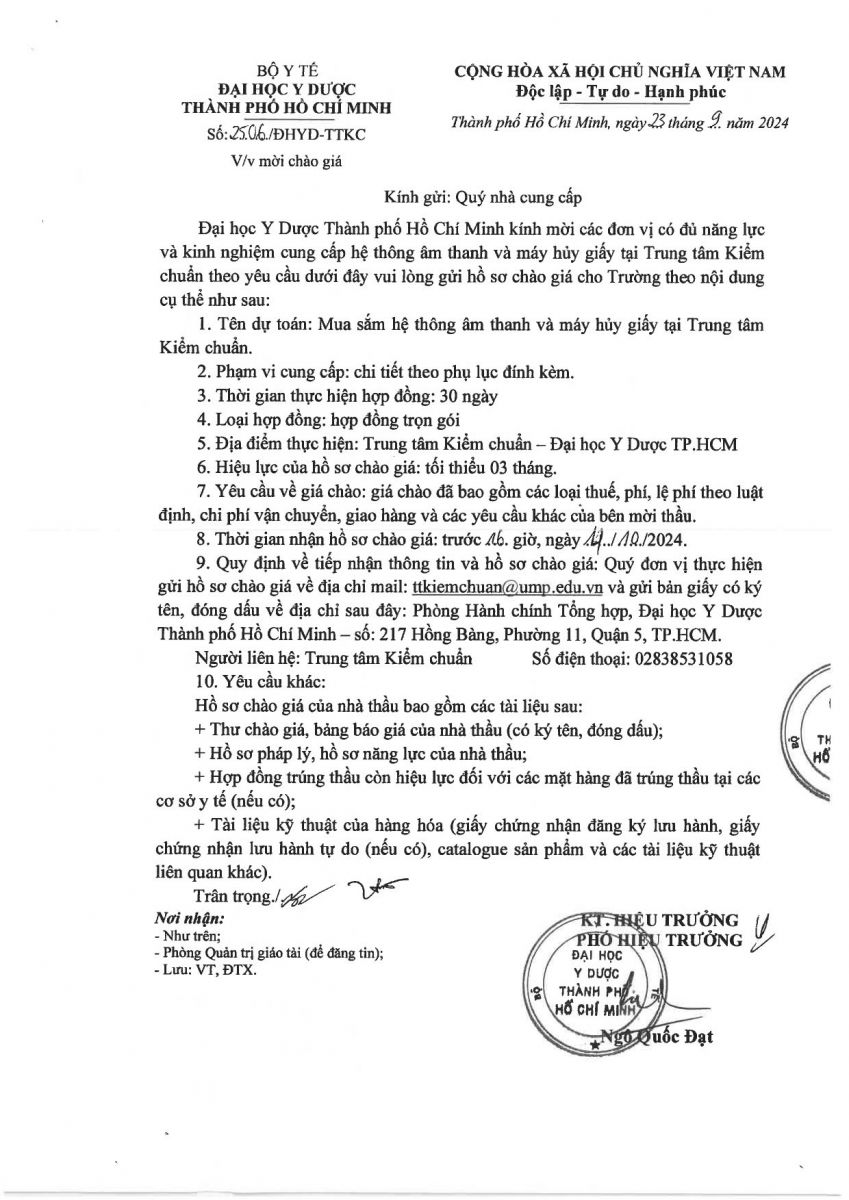 Thời gian nhận hồ sơ chào giá: từ ngày ra thông báo đến trước 16 giờ 00 ngày 04/10/2024