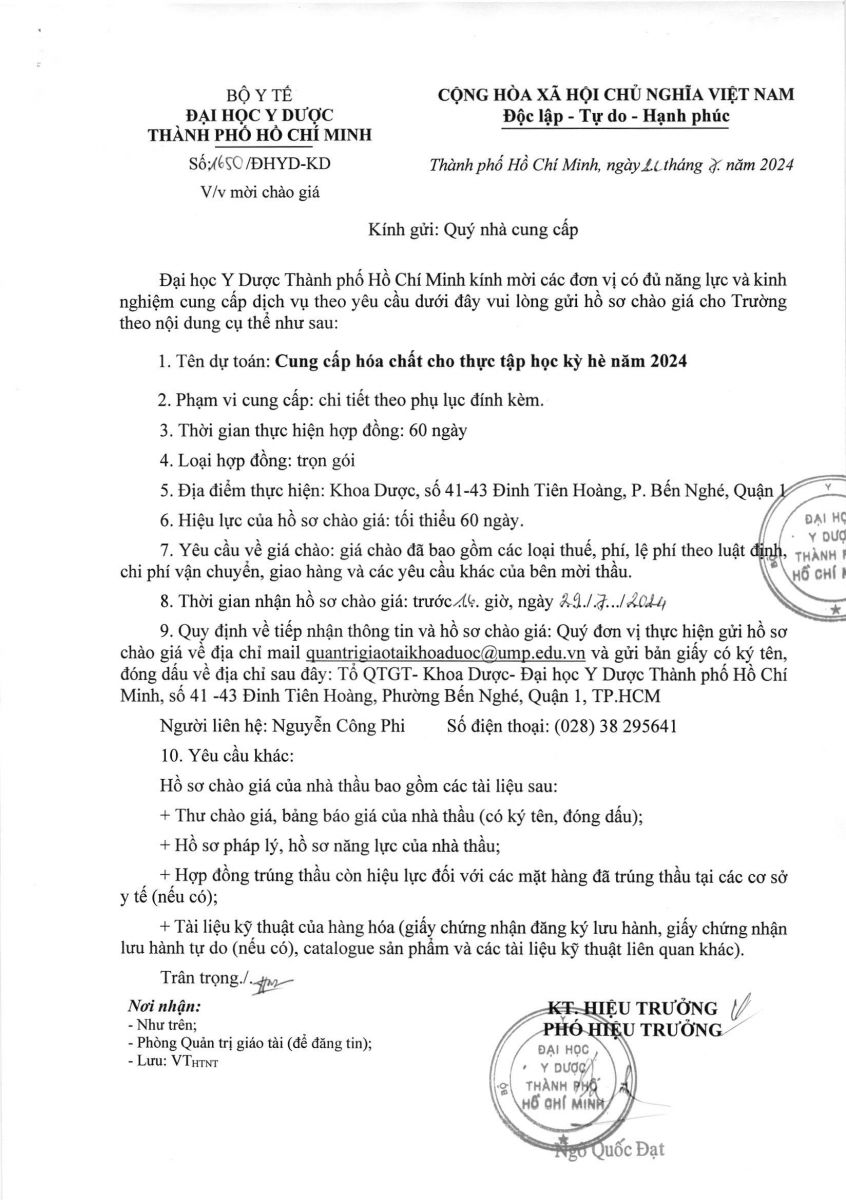 Thời gian nhận hồ sơ chào giá: từ ngày ra thông báo đến trước 16 giờ 00 ngày 29/7/2024