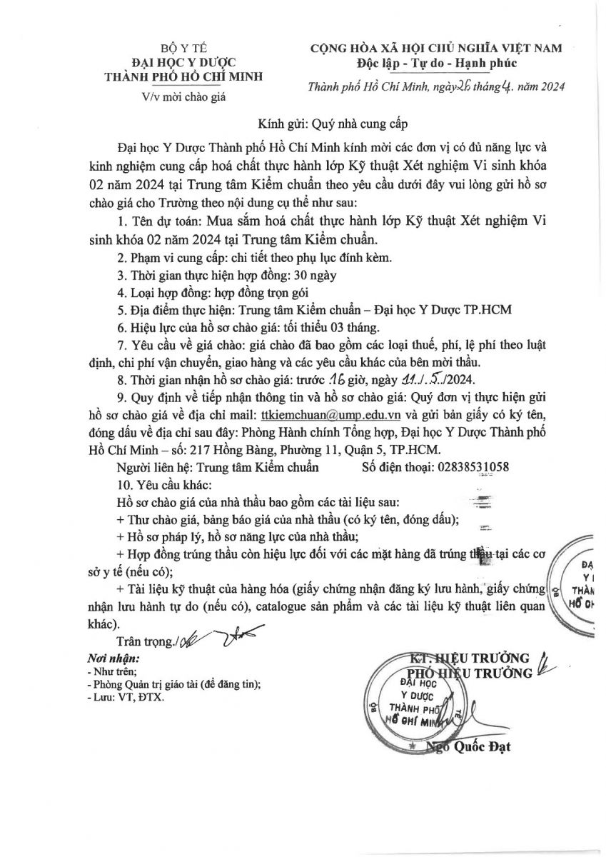Thời gian nhận hồ sơ chào giá: từ ngày ra thông báo đến trước 16 giờ 00' ngày 11/5/2024