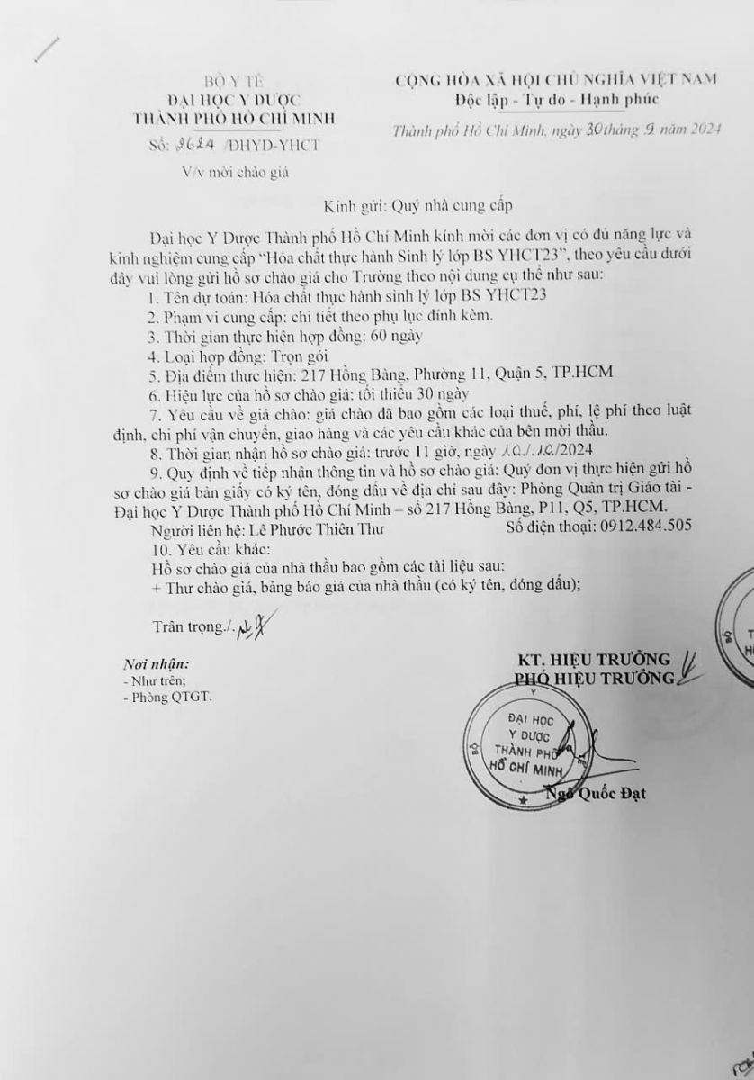 Thời gian nhận hồ sơ chào giá: từ ngày ra thông báo đến trước 11g00 ngày 10/10/2024