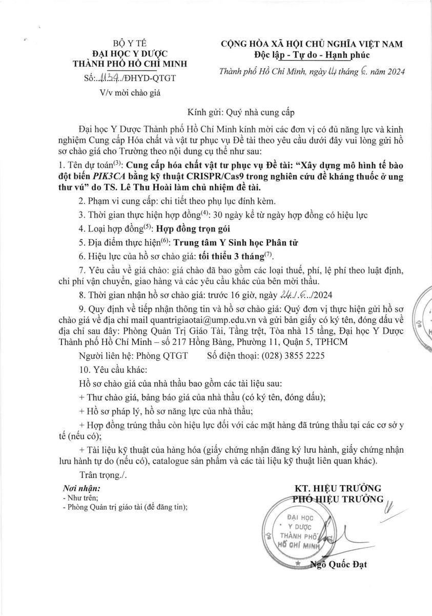 vx88 code mời chào giá: "Cung cấp hóa chất vật tư phục vụ Đề tài: “Xây dựng mô hình tế bào đột biến PIK3CA bằng kỹ thuật CRISPR/Cas9 trong nghiên cứu đề kháng thuốc ở ung thư vú” - vx88 esball vx88b