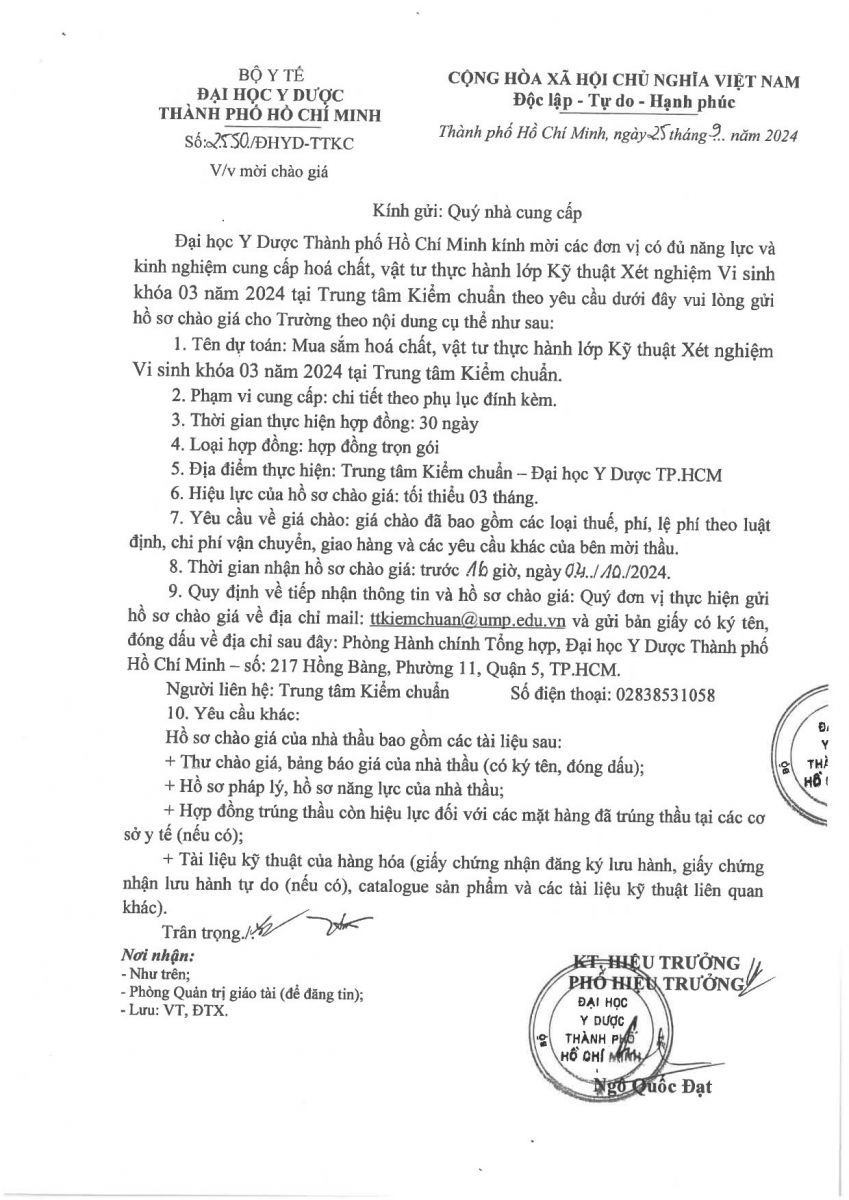 Thời gian nhận hồ sơ chào giá: từ ngày ra thông báo đến trước 16 giờ 00 ngày 04/10/2024