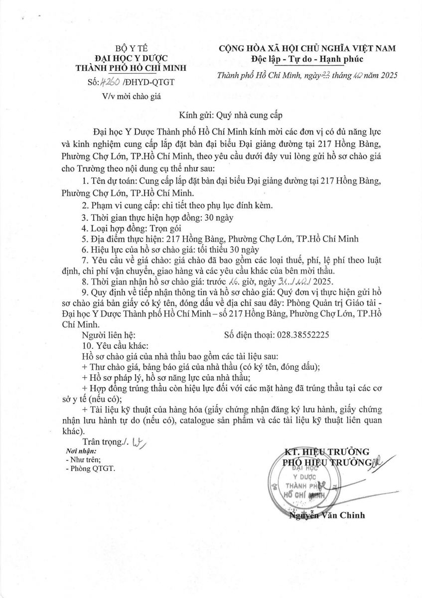 Thời gian nhận hồ sơ chào giá: từ ngày ra thông báo đến trước 16 giờ, ngày 31/10/2025