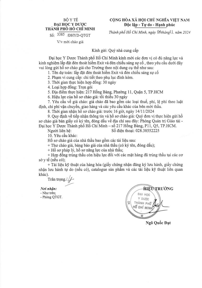Thời gian nhận hồ sơ chào giá: từ ngày ra thông báo đến trước 16 giờ 00 ngày 14/11/2024