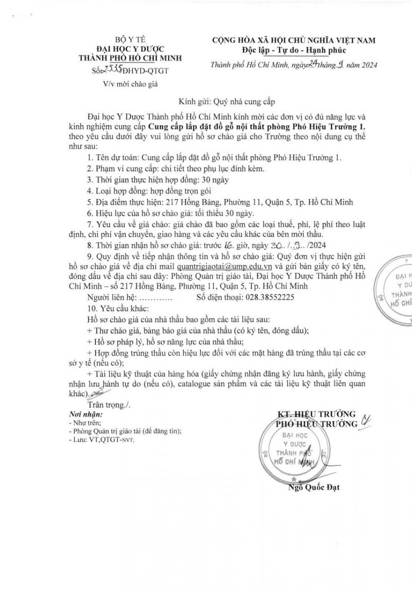 Thời gian nhận hồ sơ chào giá: từ ngày ra thông báo đến trước 16 giờ 00 ngày 30/9/2024