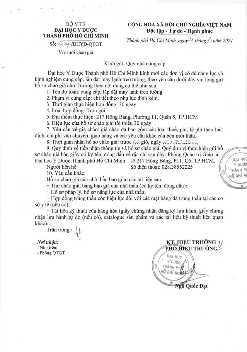 Thời gian nhận hồ sơ chào giá: từ ngày ra thông báo đến trước 10 giờ 00 ngày 02/7/2024