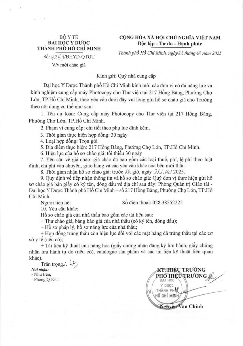 Thời gian nhận hồ sơ chào giá: từ ngày ra thông báo đến trước 16 giờ, ngày 31/10/2025