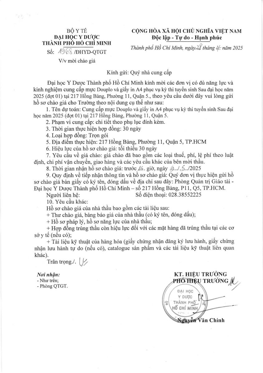 Thời gian nhận hồ sơ chào giá: từ ngày ra thông báo đến trước 16 giờ, ngày 09/5/2025