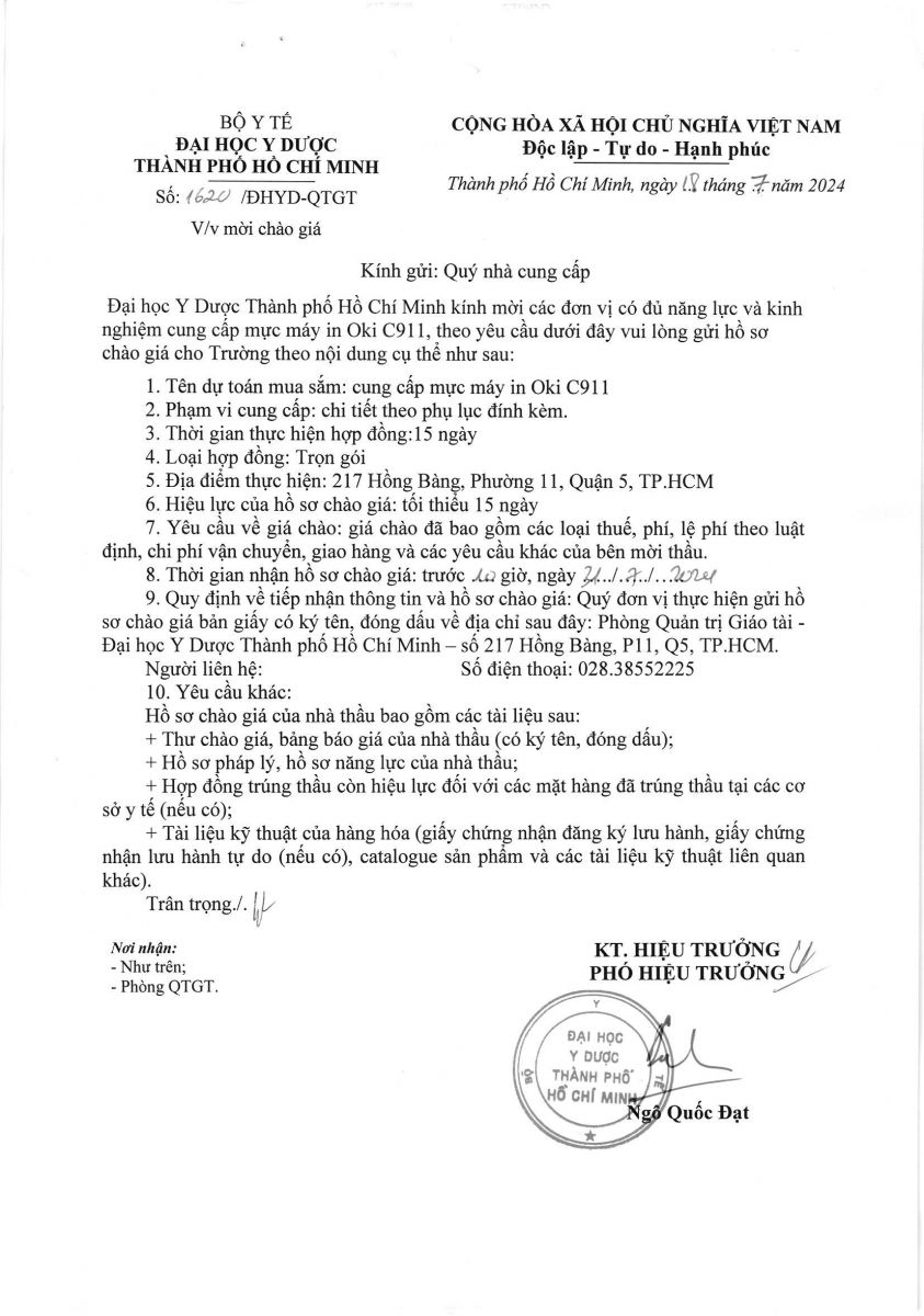 Thời gian nhận hồ sơ chào giá: từ ngày ra thông báo đến trước 10 giờ 00' ngày 31/7/2024