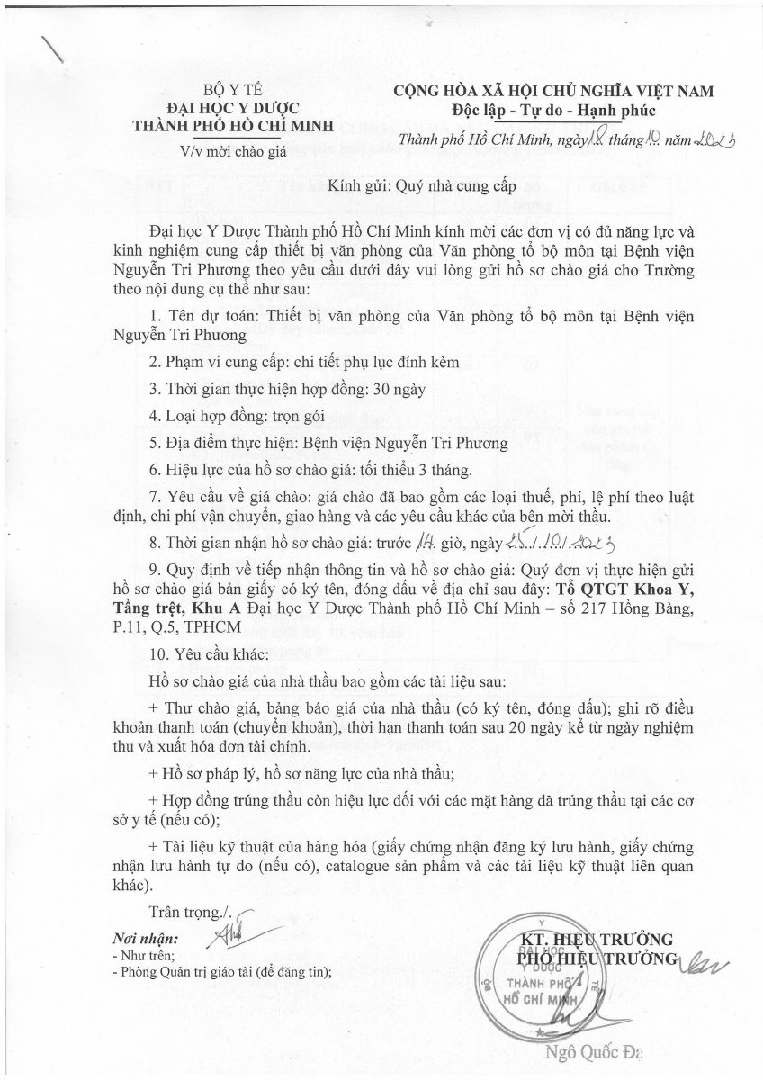 Thời gian nhận hồ sơ chào giá: từ ngày ra thông báo đến trước 14g00 ngày 25/10/2023