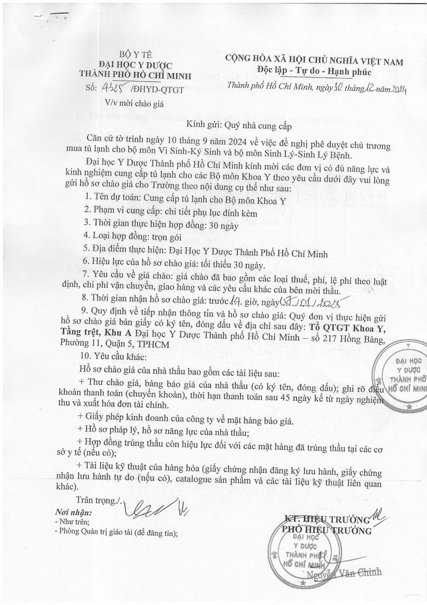 Thời gian nhận hồ sơ chào giá: từ ngày ra thông báo đến trước 14 giờ, ngày 07/01/2025