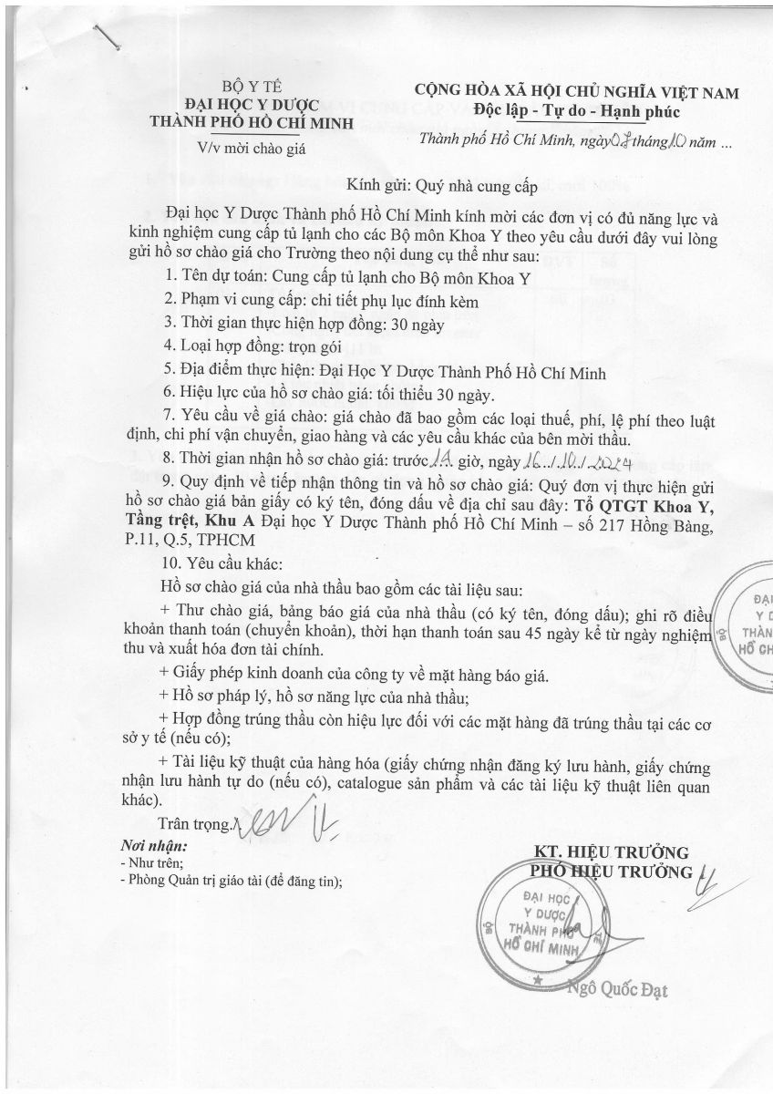 Thời gian nhận hồ sơ chào giá: từ ngày ra thông báo đến trước 14 giờ ngày 16/10/2024